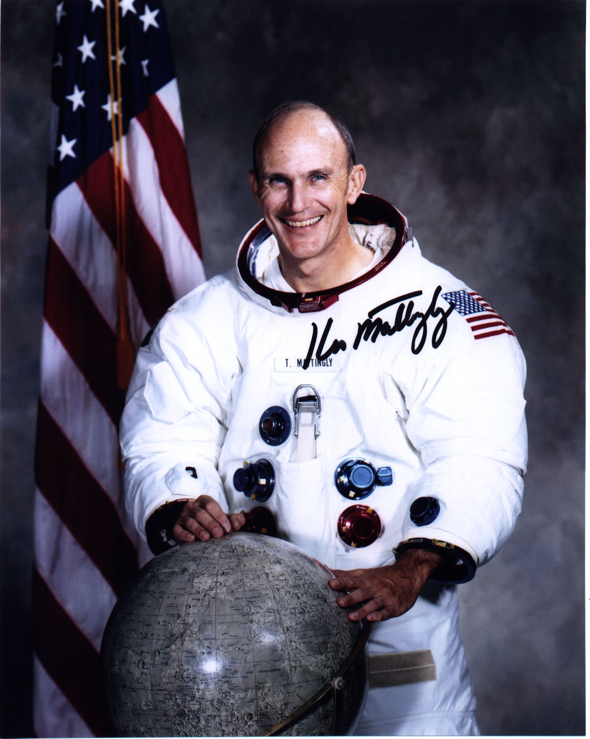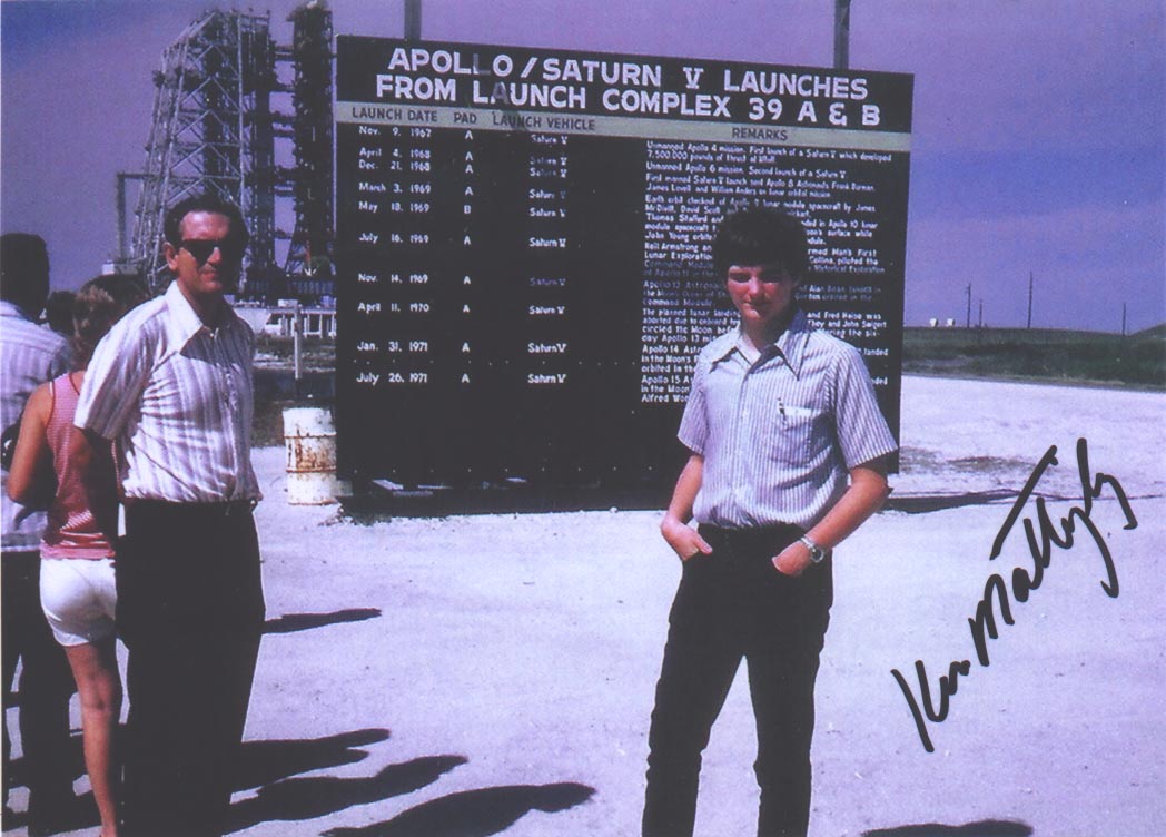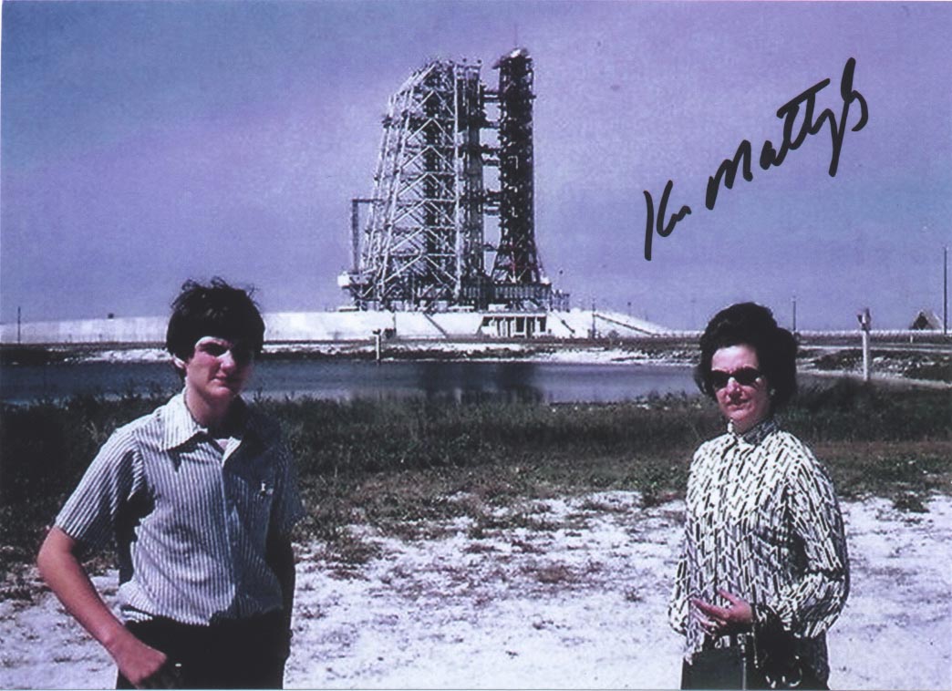 While on a Florida family vacation on February 27, 1972 we visited the Kennedy Space Center. Astronaut and retired Rear Admiral Thomas Kenneth Mattingly II was Command Module Pilot (CMP) for the Apollo 16 mission whose Saturn V rocket was sitting on the pad that day. At left is a signed Apollo 16 white spacesuit portrait of Admiral Mattingly.